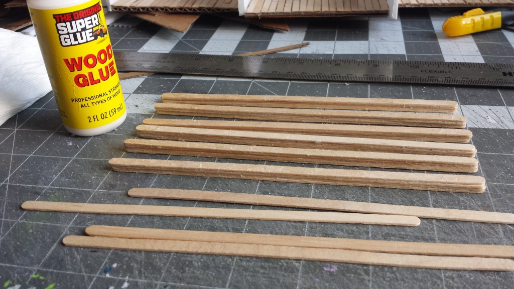 I did stay up a little bit last night as well to start on the second floor. I though I should make some beams. Without having picked up some .25″x.25″x12″ balsa to use, I ended up laminating some stir sticks (4) into a somewhat square beam using dollar store wood glue. These would be glued into place to support the second floor much like a “real” home. I even started to lay down some flooring. And in the olde world fashion, I did break the boards for a damaged floor effect.