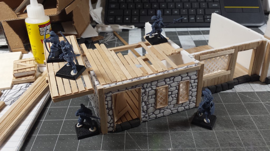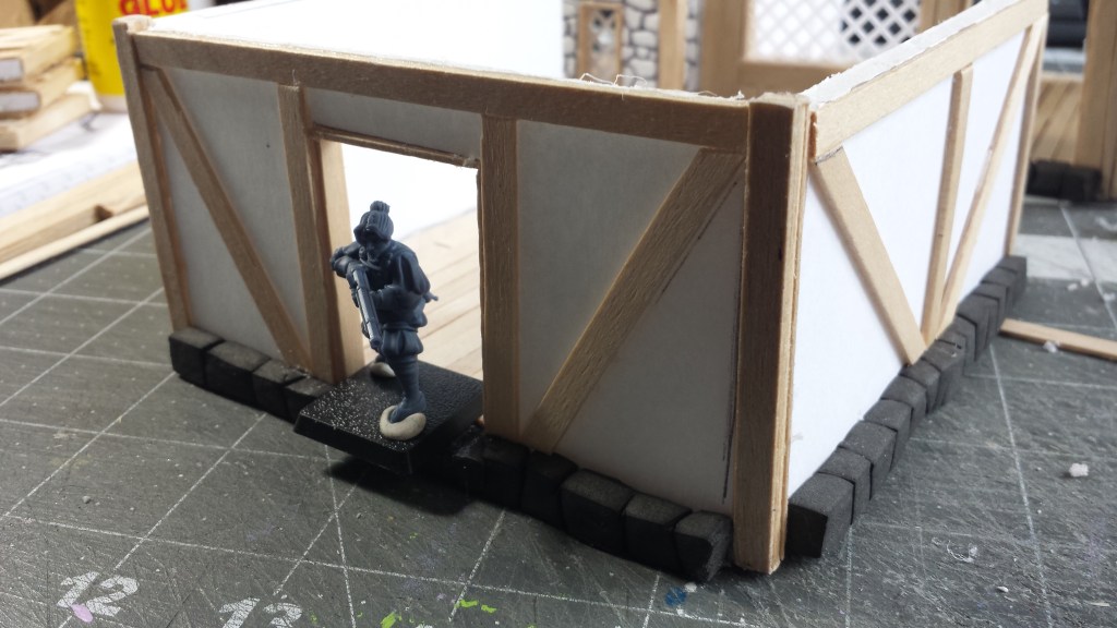 Which leads us to today. I looked the terrain piece and I thought this was a little too big. But how to downsize? Well, cut off one of the adjacent structures. Thus one building foundation, became two. And I basically spent the past hour adding stonework along the bottom edge, some inlaid wooden “planks”, as well as rebuilt the walls (out of foamboard).