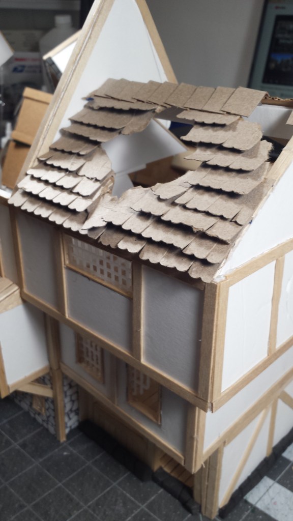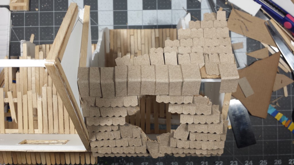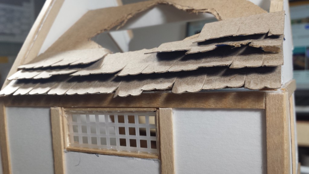 I had this notion to create a network of beams that “supported” the roof planks. But then I thought, nah. I just cut out a section of cardboard to fit the roof area. A little bit of glue…see what I did there…and viola’ – a foundation to glue my roof shingles.