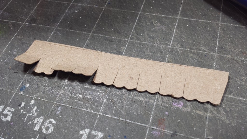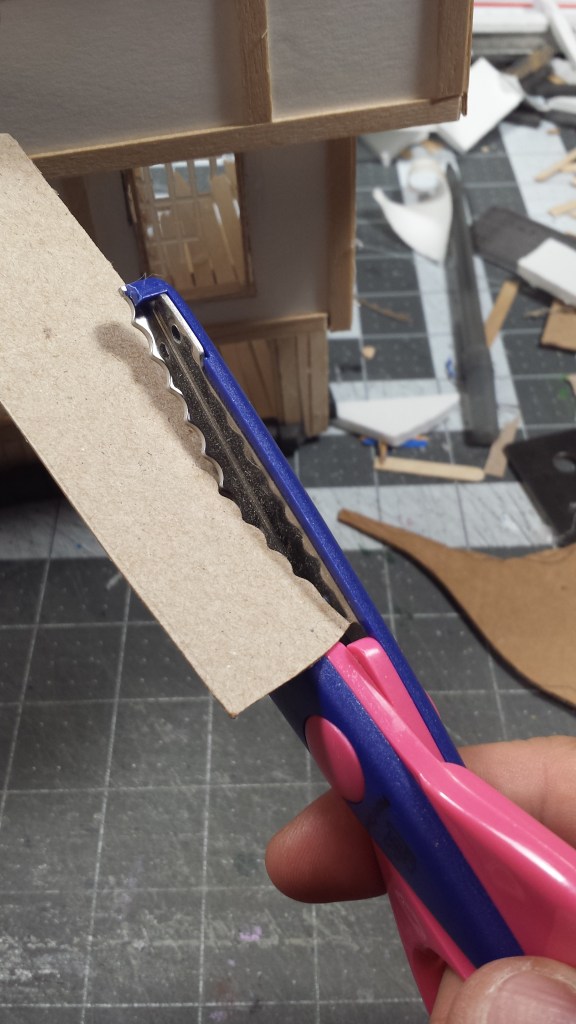 For the shingles, I used the proven method of employing pinking shears to cut a scallop shape of my “roof plate” material. In this case, the material I am using is old, thin card tissue boxes I have collected over a few cold/flu seasons. They are easy to cut with the pinking shears. If you can’t get a hold of these specialty scissors, I have an affiliate link to some off the Amazon site.