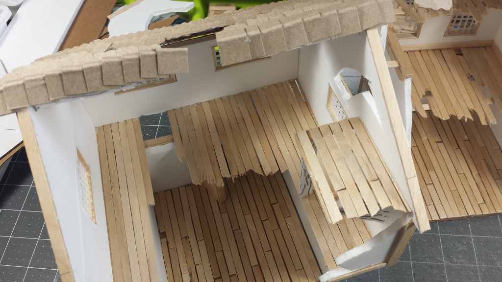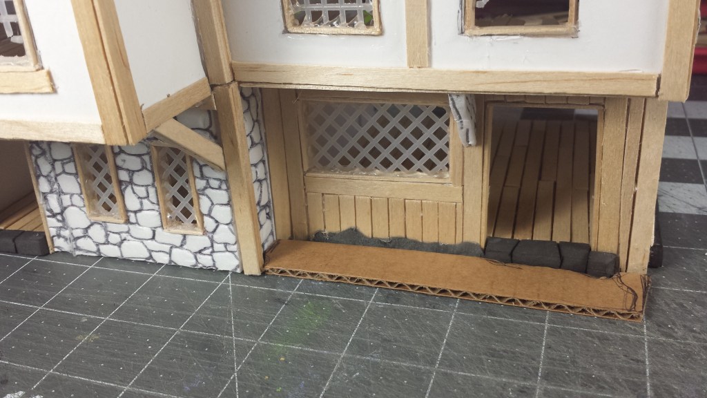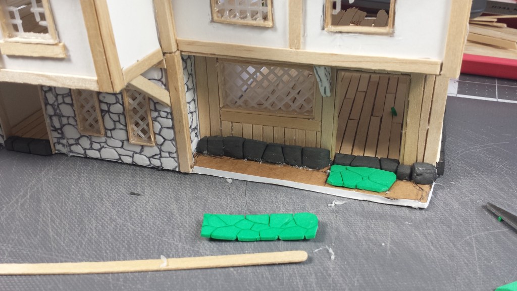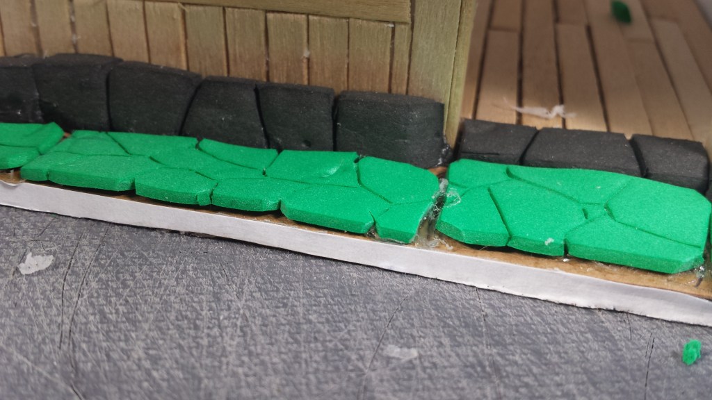 Hi. Happy Wednesday evening. Today I went about addressing an issue I found with building the duplex rowhouse with a front overhang. It tends to want to lean forward because of the weird center of gravity being that it has an open back. I added a little “foot” that sort off prevents the structure front going past the tipping point – at least for now. I clad it with thin EVA 2mm sheet (in green). I carved the stones with a blade and used a heat gun to open the cuts and seal the foam. This is a trick I learned from years of using EVA foam in my cosplays.