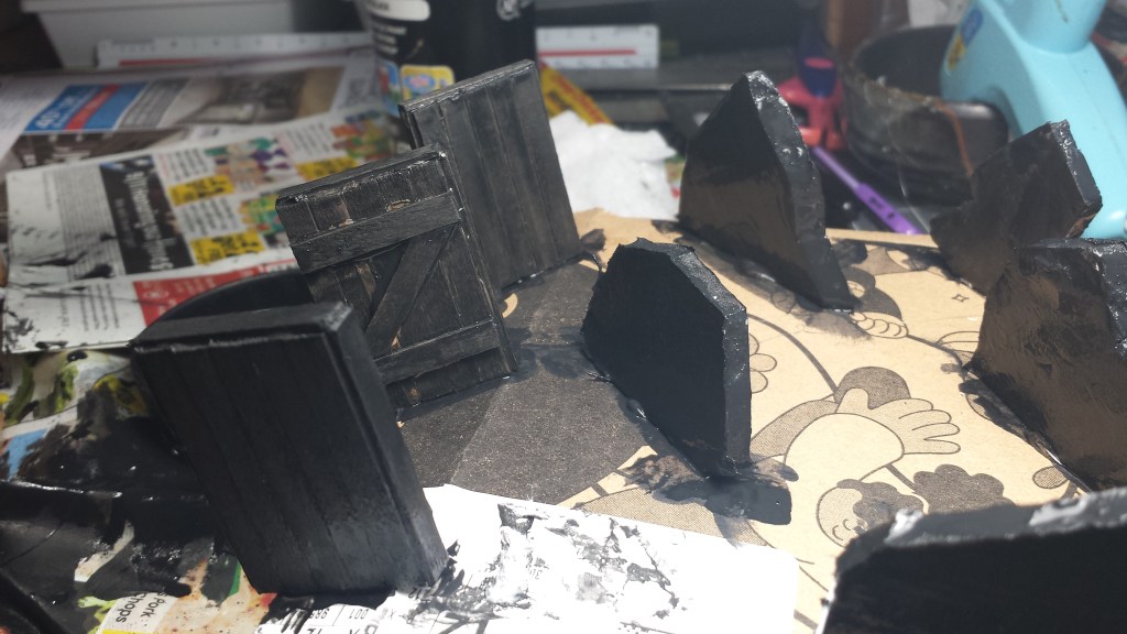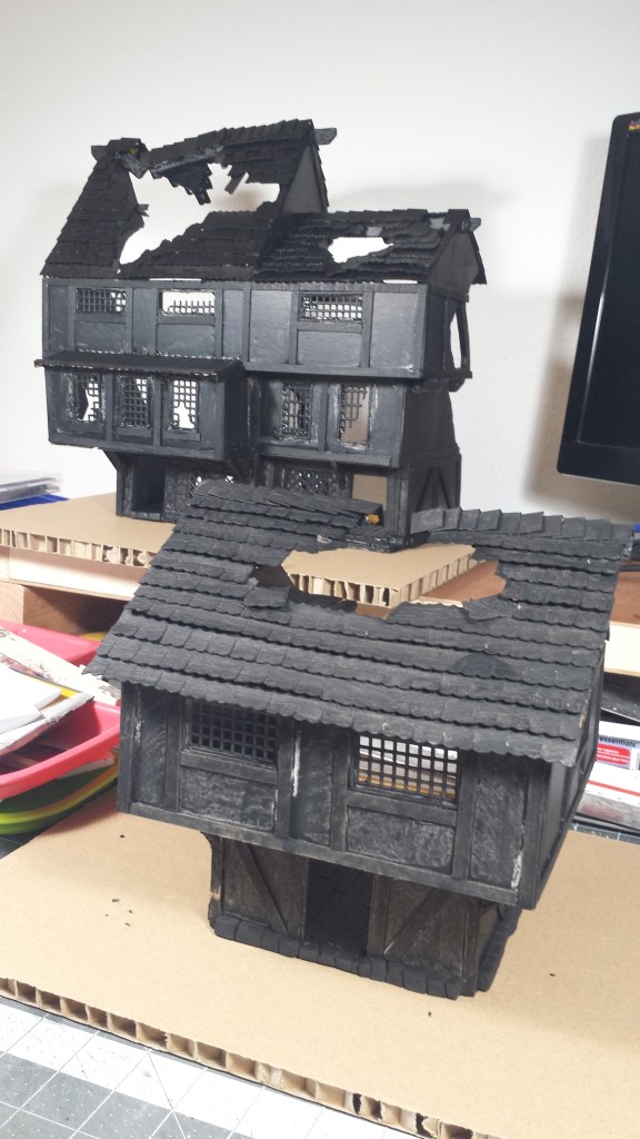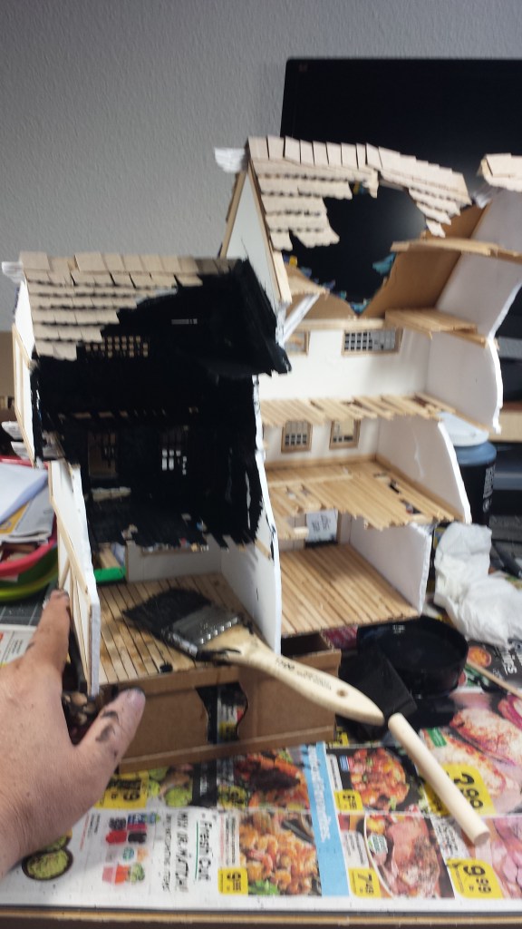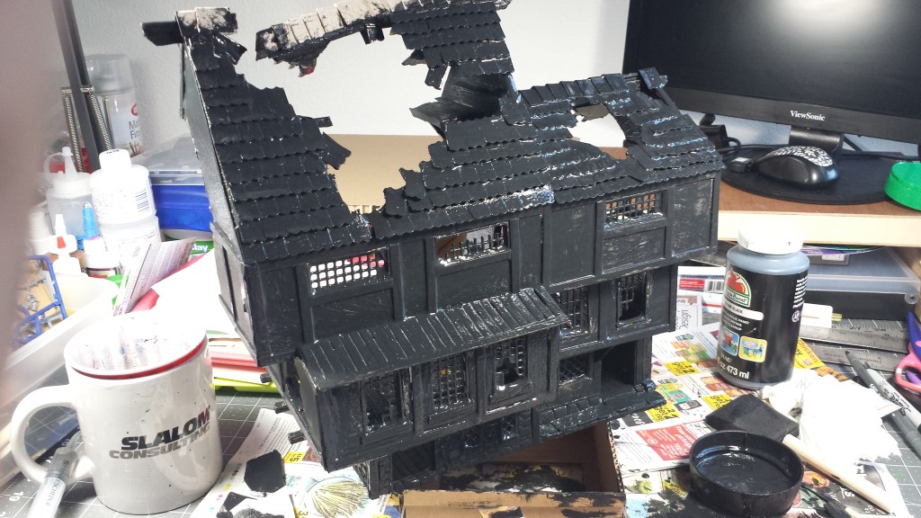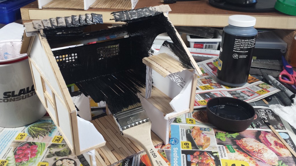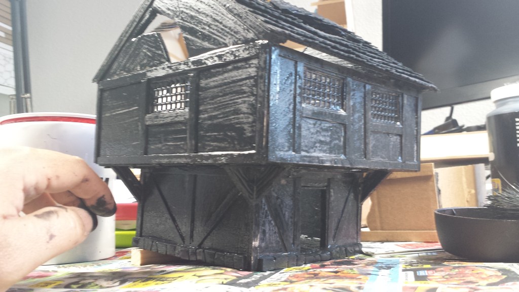 Priming and Sealing time! I mixed up some prime sealer – this is a combination of 1 part PVA glue (you can buy by the 1 gallon jugs or 3.7ish liters) + 1 part black acrylic paint (cheap craft paint will do just fine usually under ~ $1 USD) + water as a thinner. Mix well (I have a lot stir sticks lying around for some reason). I then painted both structure without trying to get too messy. I used a combination of a foam brush, an inexpensive bristle brush as well as a standard paint brush to apply the paint to all the nooks and crannies of the builds. I will let it dry overnight before continuing the paint phase.