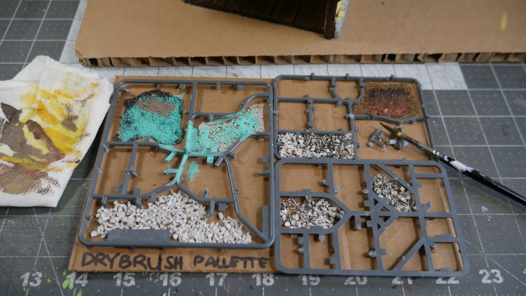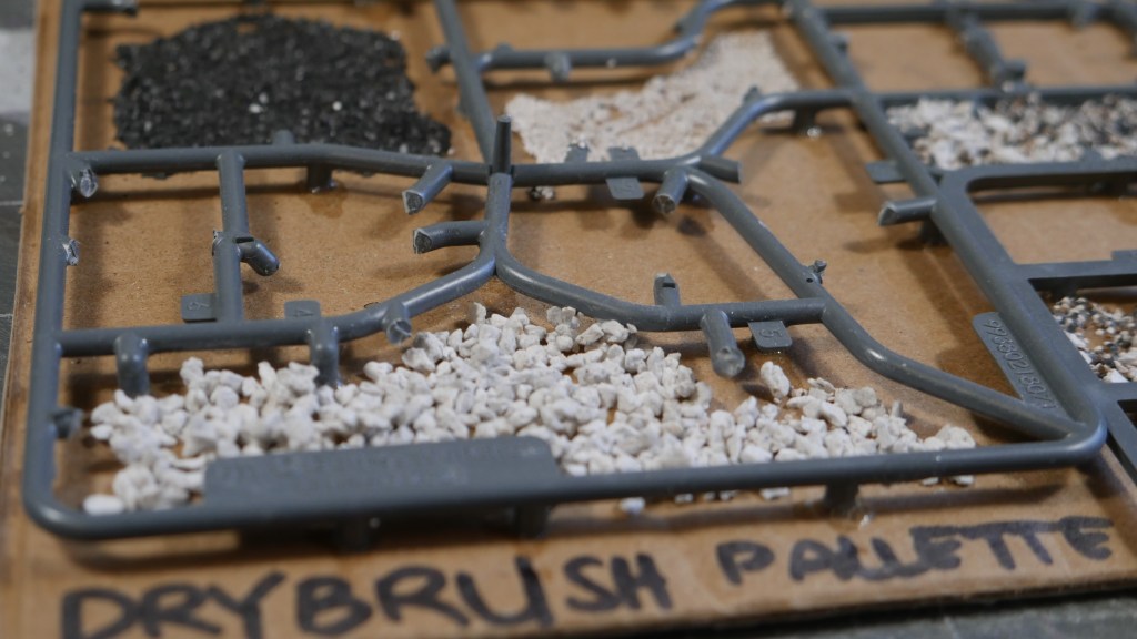 Also, I got a chance to finally try out a DIY “dry brush palette” – I know, I spelled it wrong. To be honest, I ended up just using a dry paper towel to reduce my paint volume on my brush. You can see the drybrush palette is simply made by gluing some old sprues to a flat piece of cardboard. I then glued on some texture, like small rocks and sand to provide texture for the paint to rub off of. You use it by brushing away excess paint on the various surfaces.