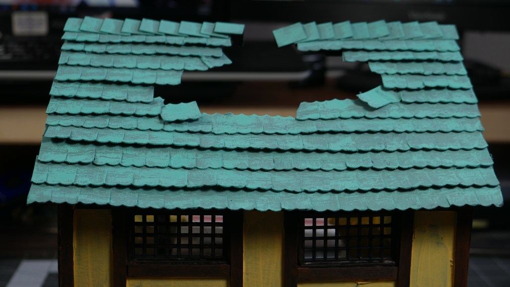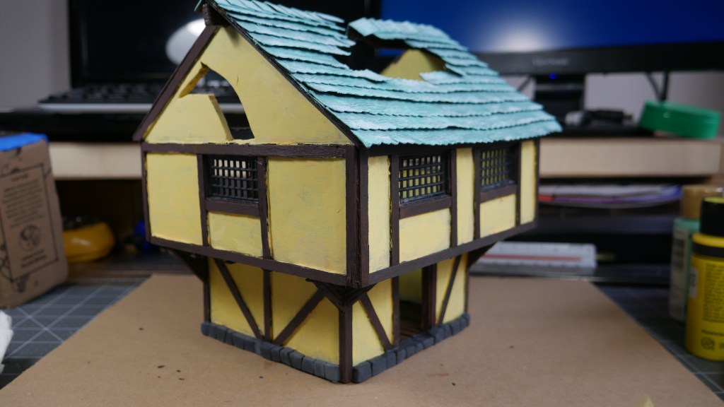 Take the roof for example. I started with a dark base layer of a nice turquois shade and mixed in black to get a darker tone. I started adding lighter shades by mixing white into the original shade on my wet palette. I added more white to get a gradient of sorts. As the layers started to contrast, I realized I probably should have started with a darker shade. Then again, I will be black washing this after I put all of the colors down. Plus this terrain piece is for Mordheim/Fantasy “grimdark” and it will most likely turn out fine in the end.