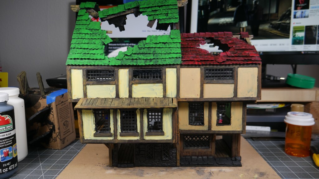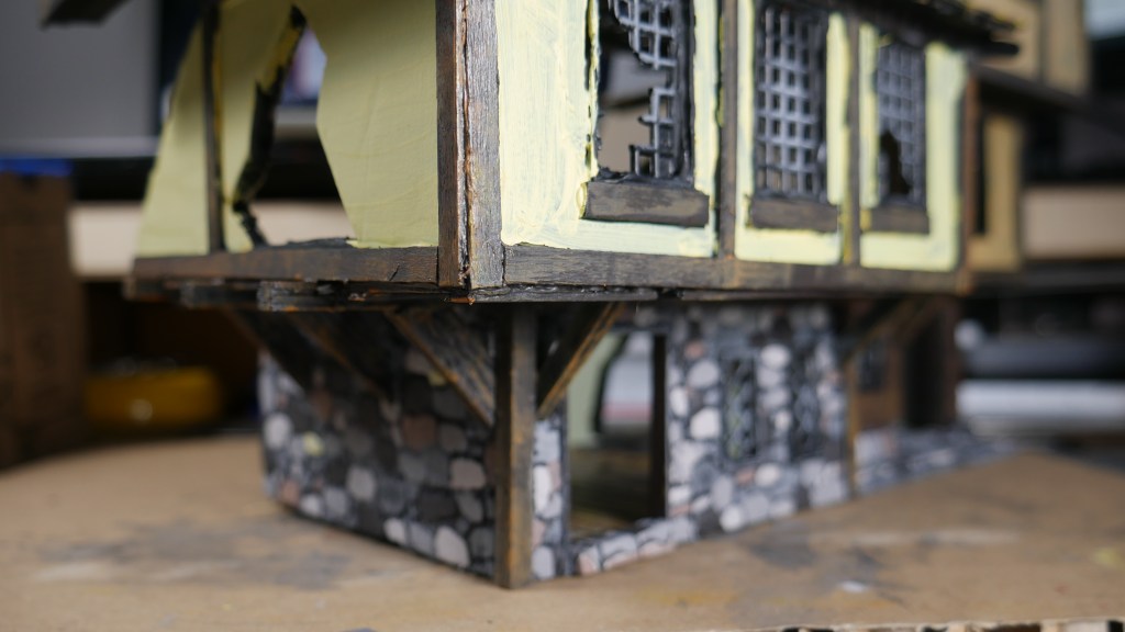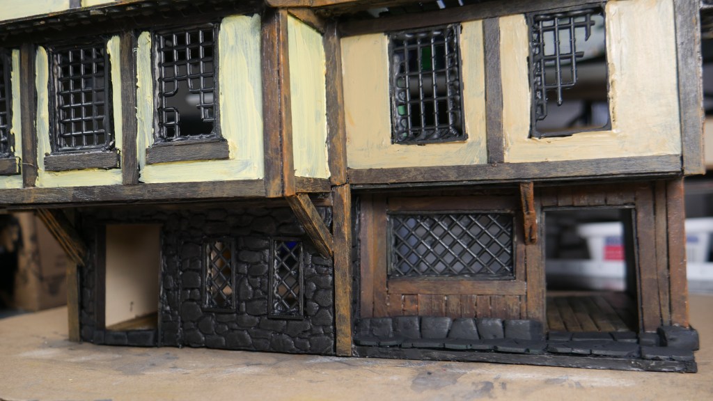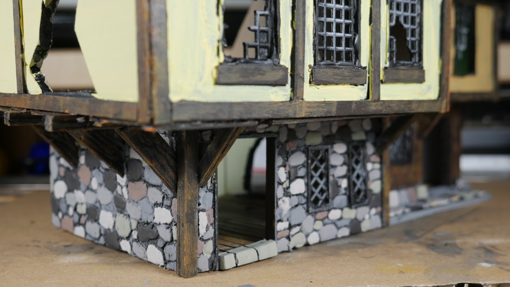 I mixed up some brown acrylic with black and laid down some undertone for the faux beams that give the building some character and help it read “olde world”. I proceeded to add lighter coats to give the beams some depth doing my best to let some of the dark undertones peak through the grains of the “wood beam” stir sticks.