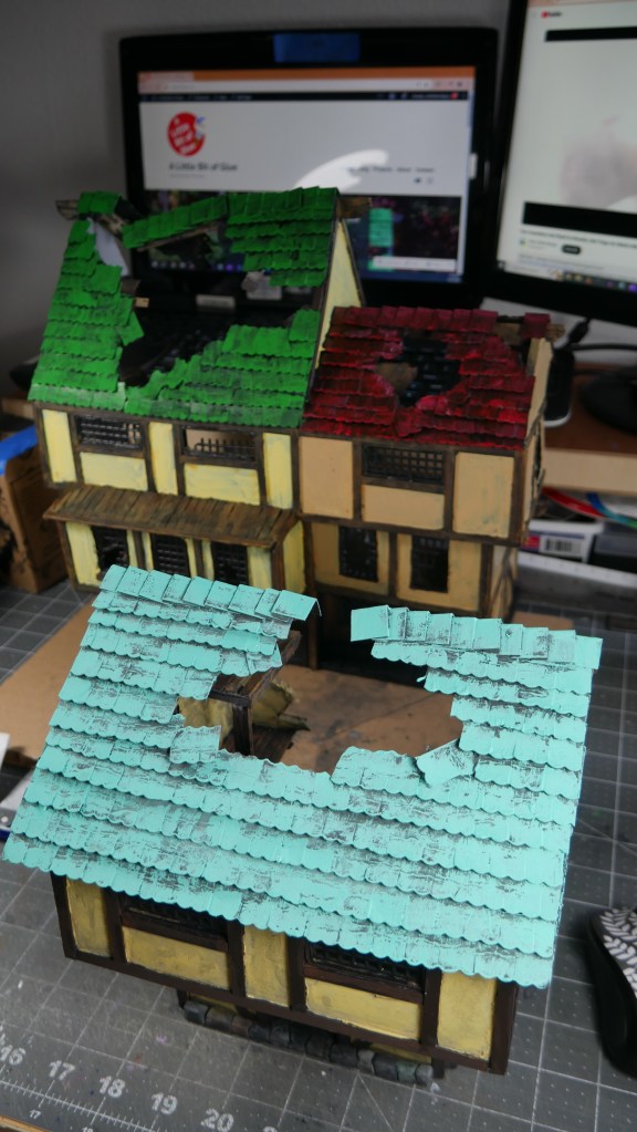 I then looked at the smaller structure and decided the roof was a bit too gloomy (for Mordheim? really?!) and I added a fresh dark coat of turquois blue.