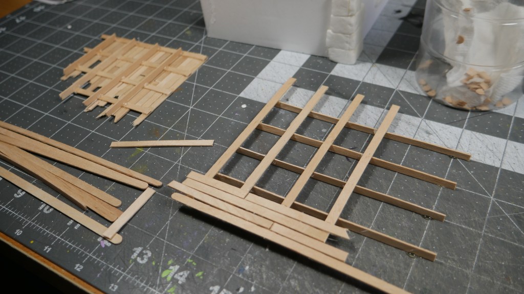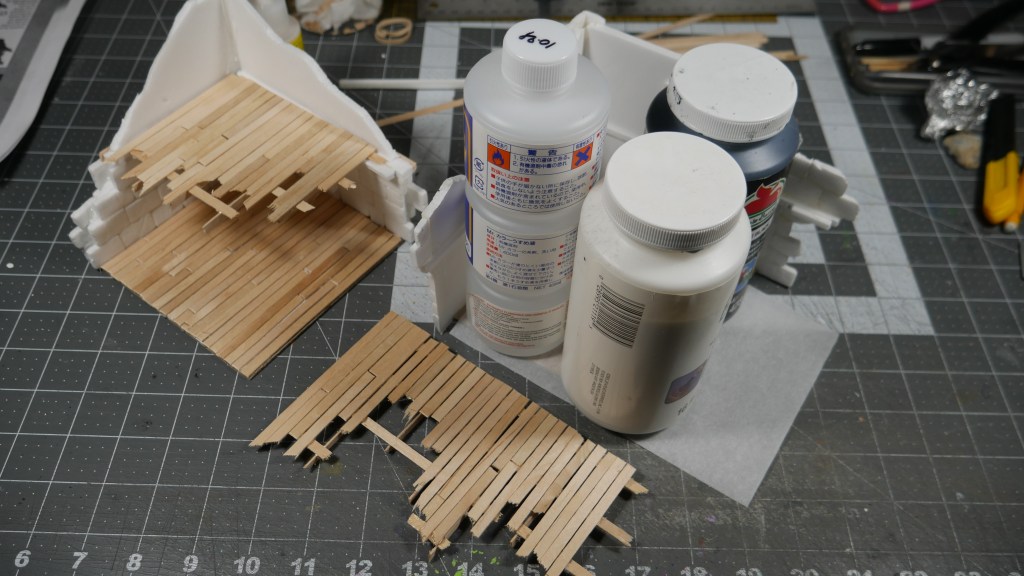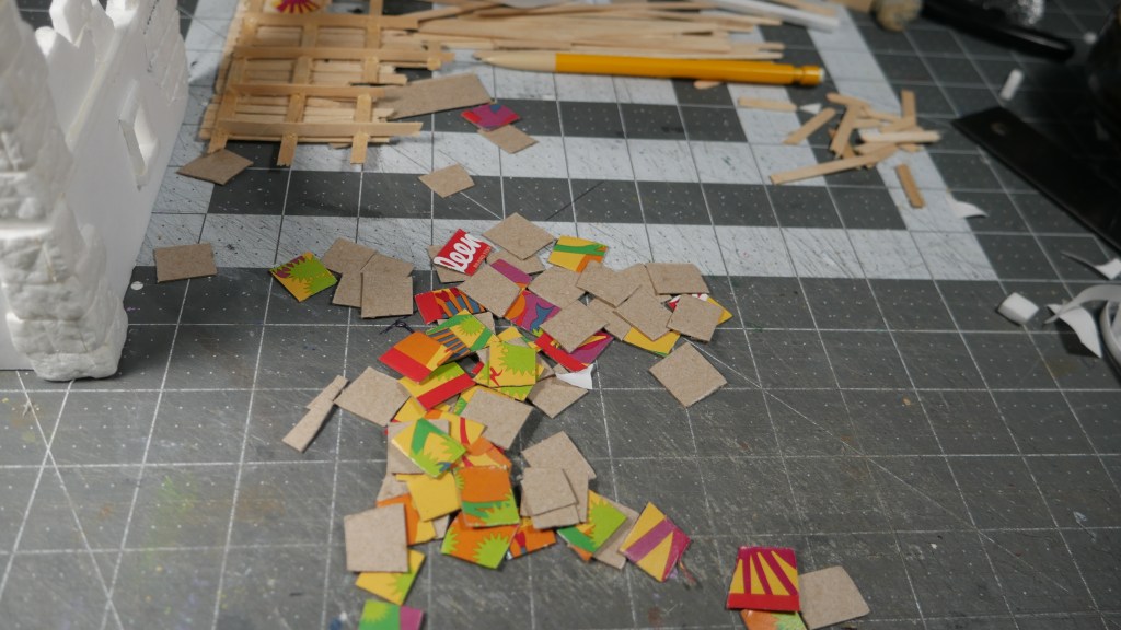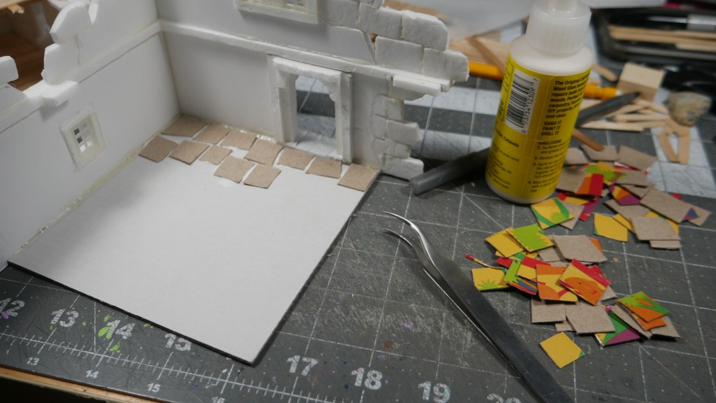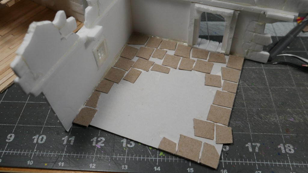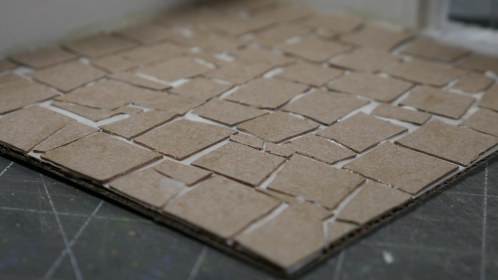 I also installed some “slate” flooring. I cut up some “cereal box” cardboard – well, in my case, some tissue box cardboard into appropriate sized stone shapes. I used wood glue – because my white PVA glue was across the room – to glue down the stonework flooring stone by stone. It was tedious, but once you get into a flow, it wasn’t too bad. I got the floor done in no time. When the flooring was done, the base material (corrugated cardboard from a keyboard box) started to warp. I placed a piece of parchment paper on top and placed some heavy bottles in an effort to flatten the base down. I will let it dry overnight and see if that helps remove the warping. I will probably have to do this again when I base/seal the structures.