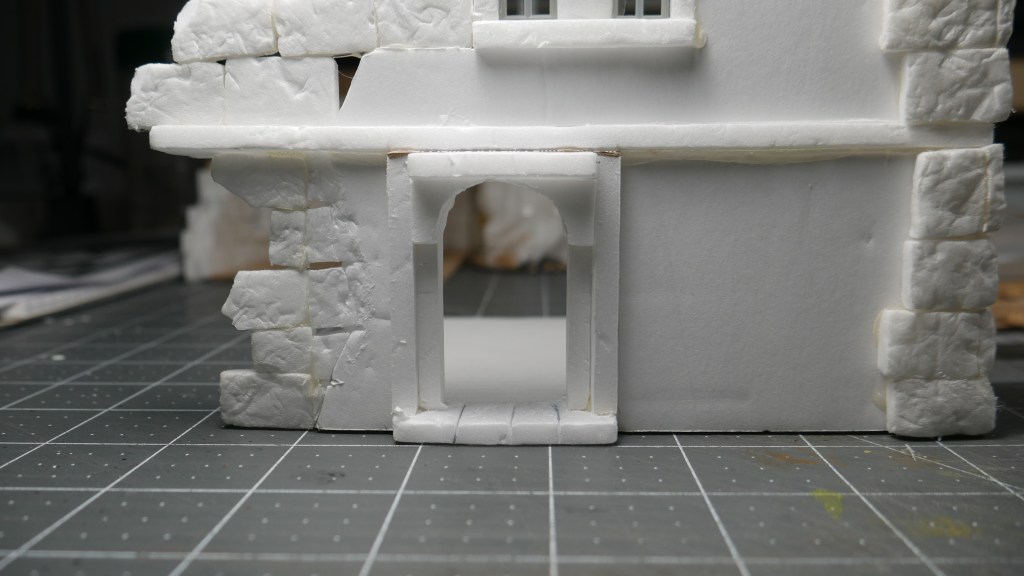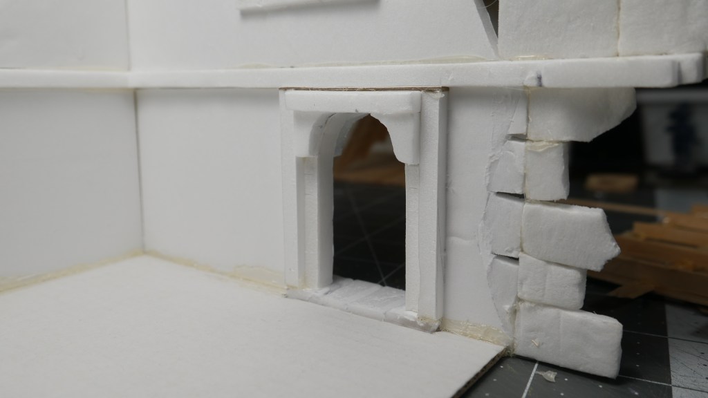 The challenge today was the recreating the arched doorway using basically the formboard and hot glue. I was able to use a lot of my off-cuts of foamboard. I created the arch by using a carpentry technique – you cut multiple slips where you want to the material to bend. Then slow bend the material allowing your cuts to separate from one side only. As long as you don’t cut through only one side the foamboard, the paper on the other side should be intact and able to make the arch. Or, I could have just cut a whole mess of smaller “bricks/stones” and created the arch one stone at a time. Meh. Maybe next time. And, no, I don’t own a 3D printer. The cost (machine, consumables, operating expense, knowledge curve) to me is not justifiable for my budget of “free.99”. Also, I am debating whether to add a door to the archway similar to my partially open doors on the first build series. What do you think?