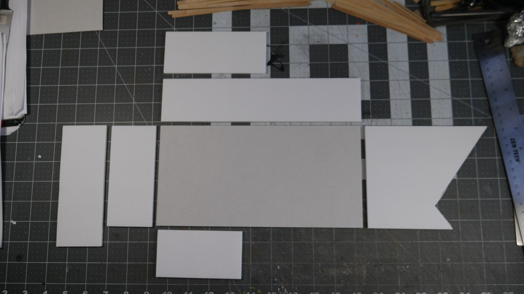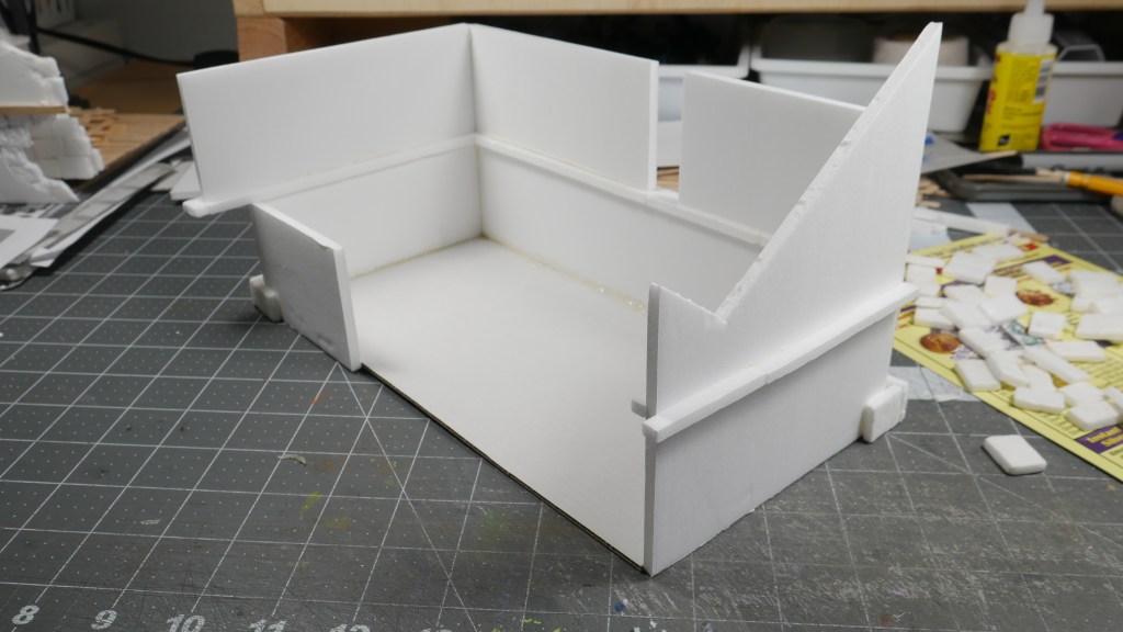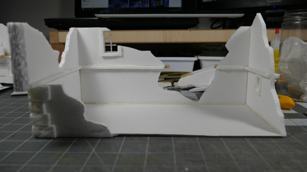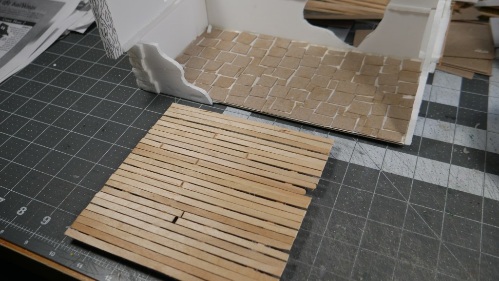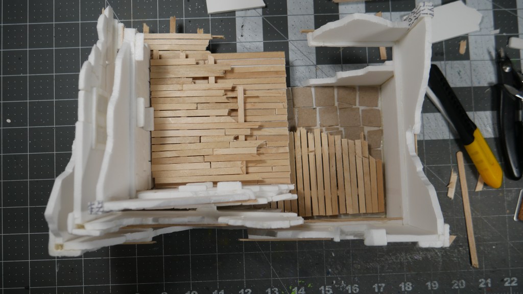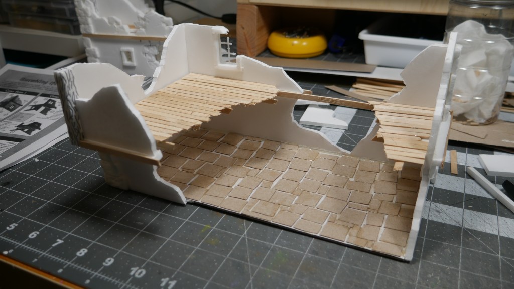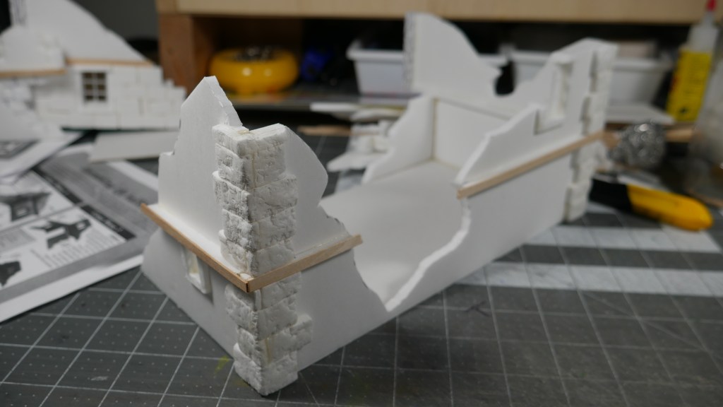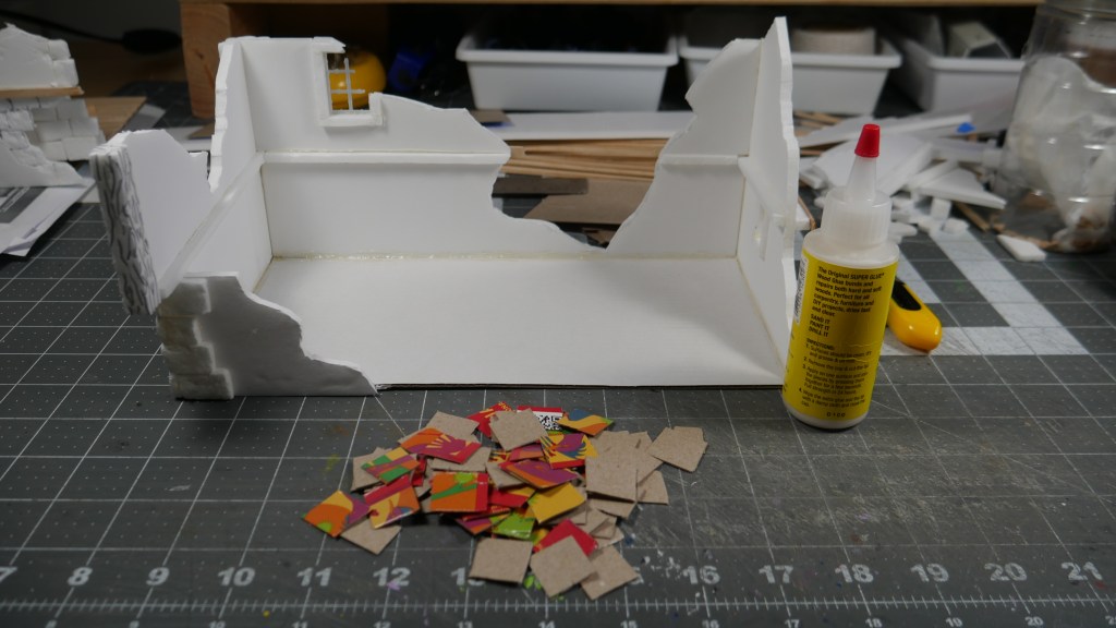 In my build, I decided to double the standard footprint of 5 inch x 5 inch (i.e. the Corner Houses) to 5 inch by 10inch (the Long House). I am getting a little faster with the build process, keeping things as standardized as possible. Including build techniques. Thus my 2.25 inch wall heights. 5″ inch square base flooring. Most of the box terrain does not include a base or bottom flooring. I wanted mine to have it.