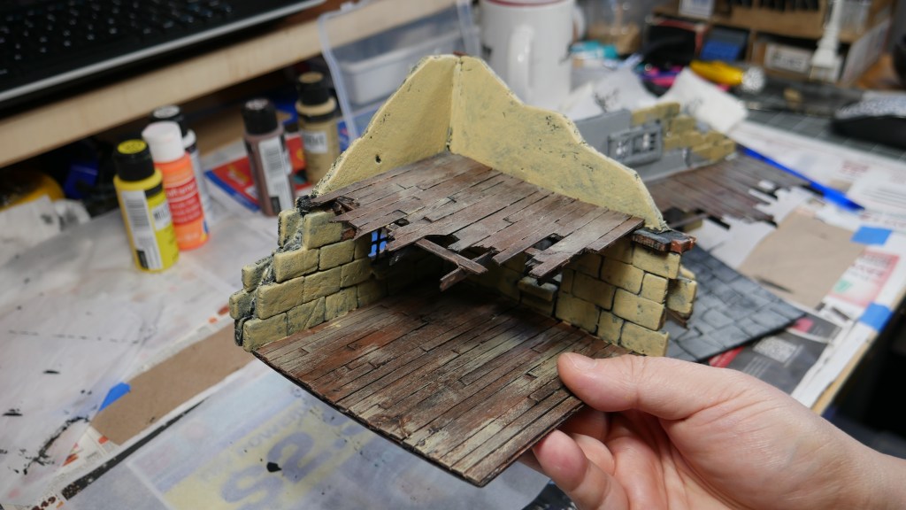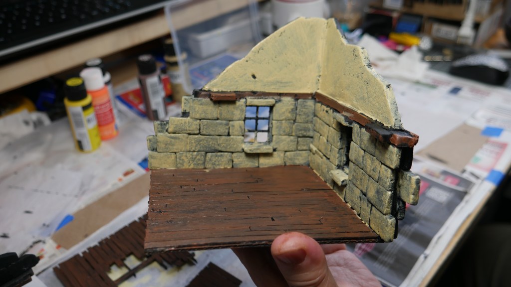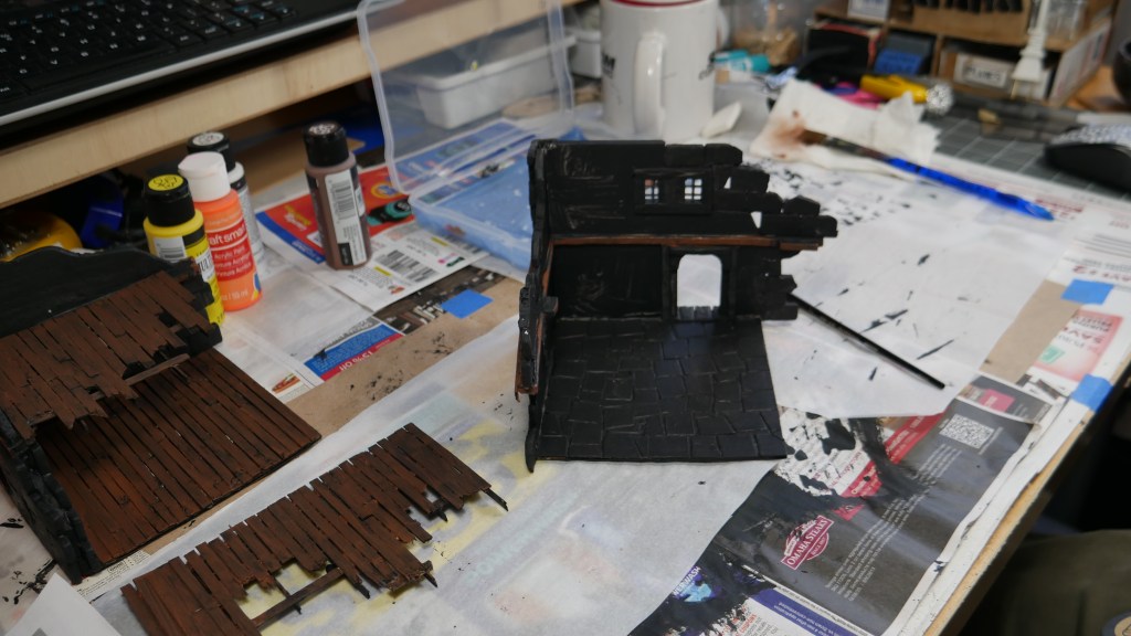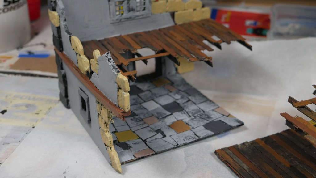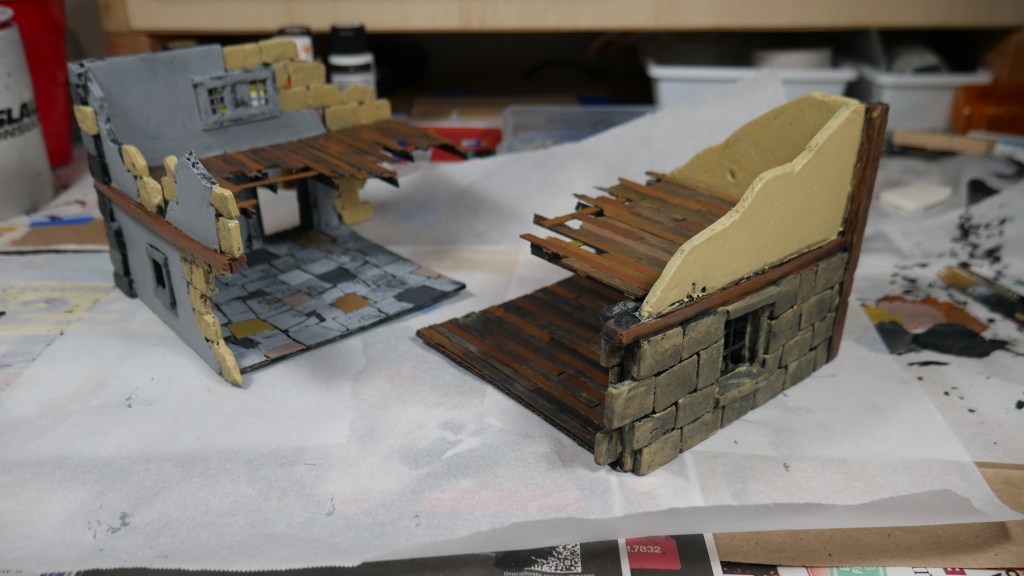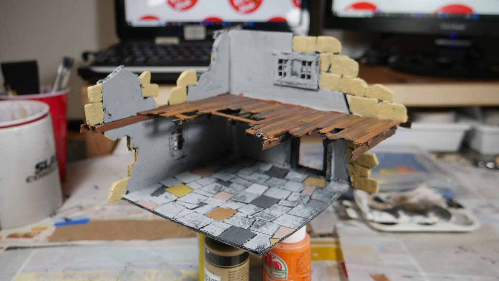 Although this is my take on the starter terrain, I wanted to pay homage to the original cardboard terrain colors by trying to paint with similar tones. I am starting with the Corner House 1 and 2 pieces. Specifically, I added some wood tones to the “wooden” portions of the structures like the flooring and side wall beams.