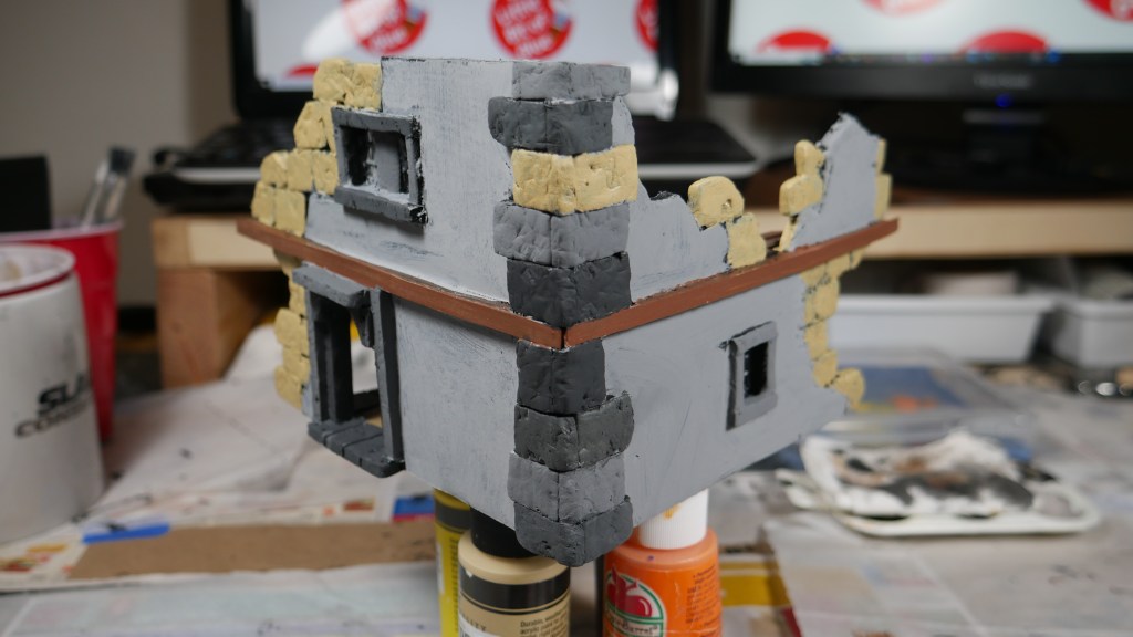 Next, I added some color to the stonework and walls. Remember, I am just using basic craft paint and cheap brushes (similar to those found at Walmart) – If you want to try some craft paints and basic brushes for your Mordheim terrain (or any other craft painting project), check out my affiliate links on the TOOLS and MATERIALS page.