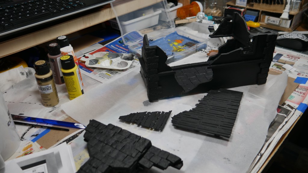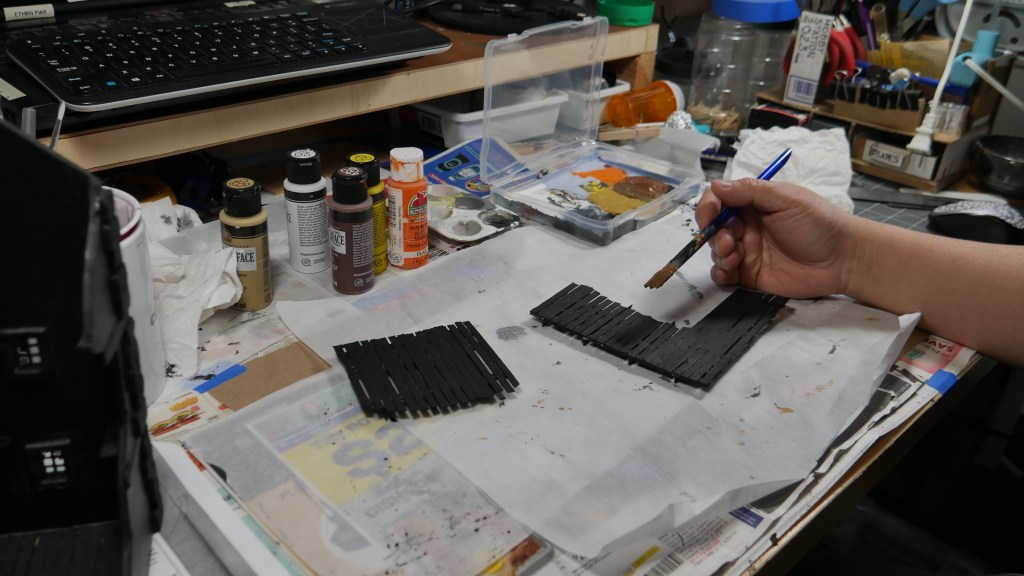 BTW – can anyone suggest a recipe for how to paint wood better? I am currently using this sequence – prime black, dark brown, mid brow, (sometimes) orange or yellow, (sometimes) drybrush white, (usually end with) black wash. No sealant at any point of the layering.