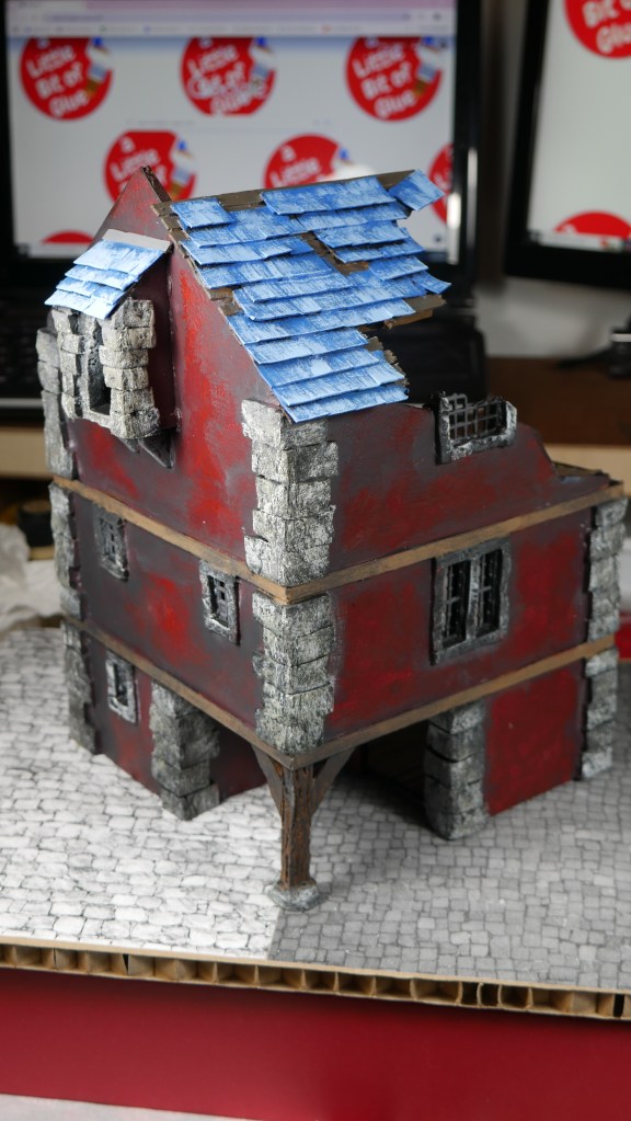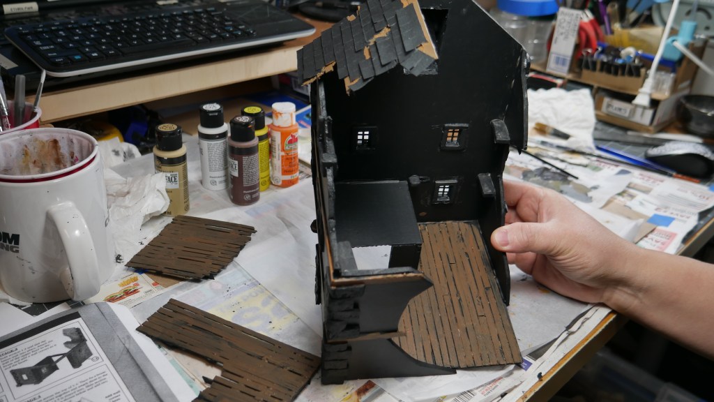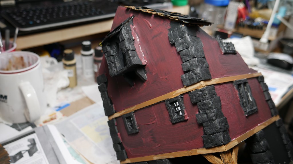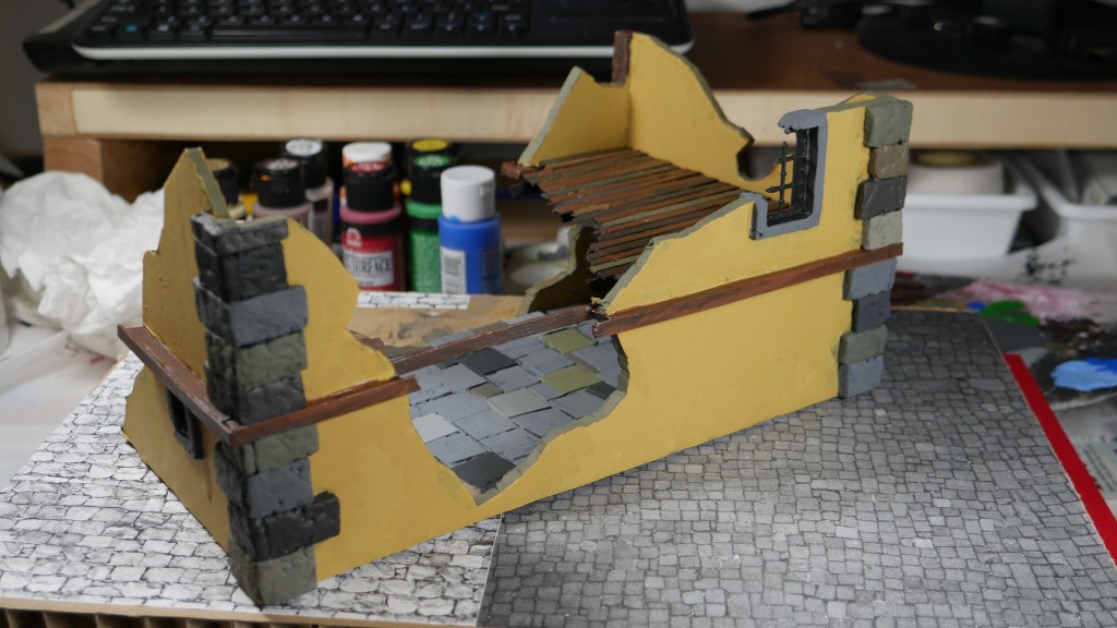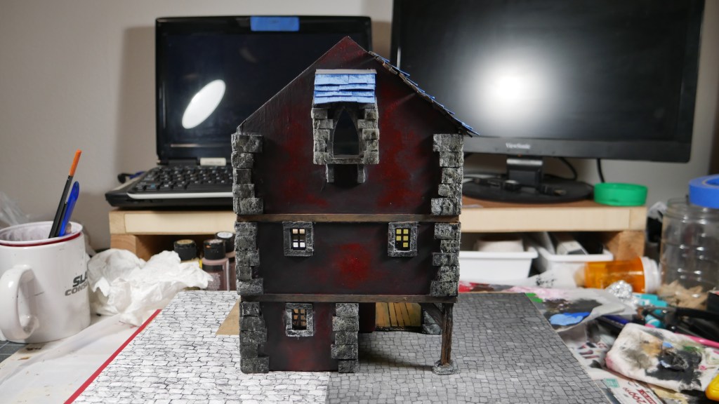 I continued to work on the Mordheim Starter Box terrain project (my take on the original). I added some color to the Long House of which I added a “stonework” floor/base. Although the terrain pieces are not “completed”, I think the added color definitely shows some progress.