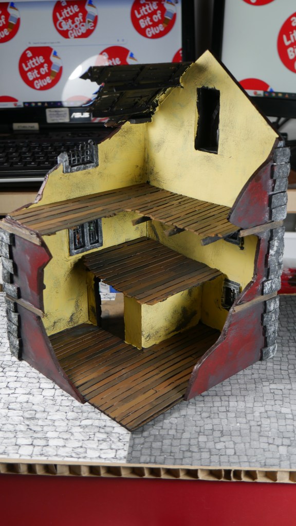 The Tavern is (was) open for business as I applied a coat of simple maroon/muted red to the exterior walls. I coated the flooring as normal with simple wood tones. I coated the inner walls with a cream color later to be detailed with cracks, graffiti, and maybe some blood splatters.