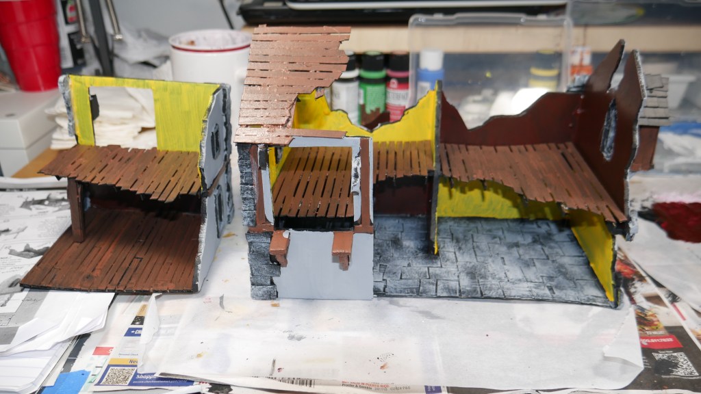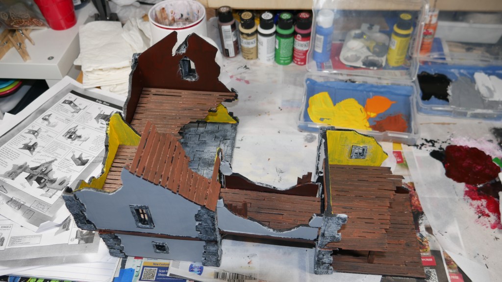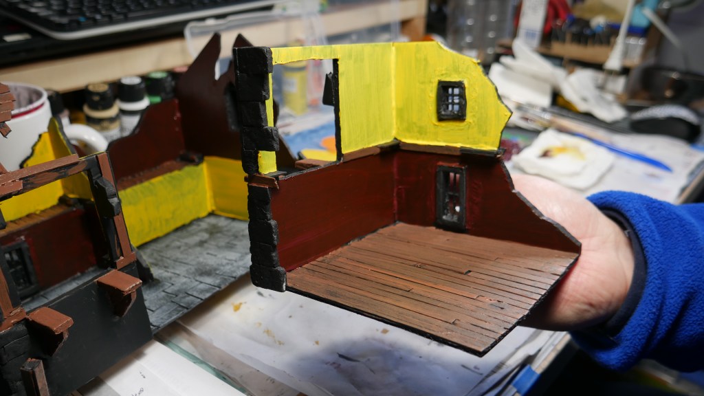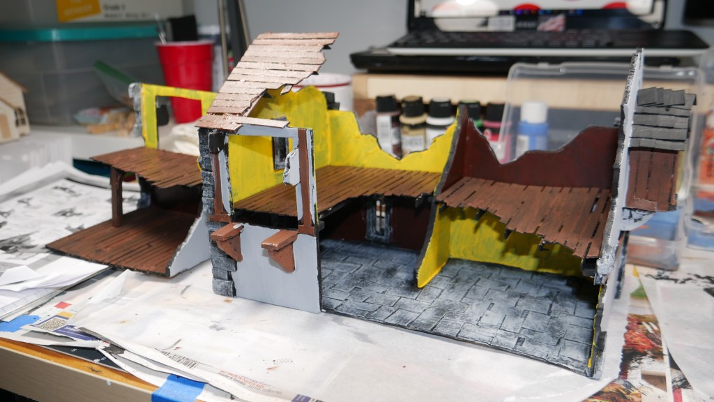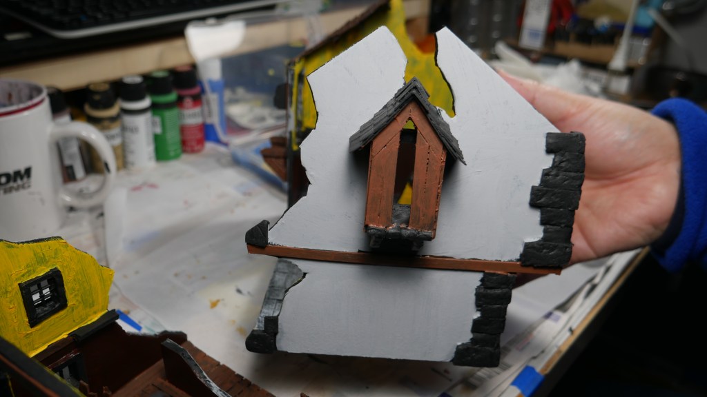 The Bridge House got some paint on the walls and after the initial paint on the “wooden” portions like the flooring and trim. I had to look up some reference pics again to find out what the original colors were and try to pay homage to them in my build.