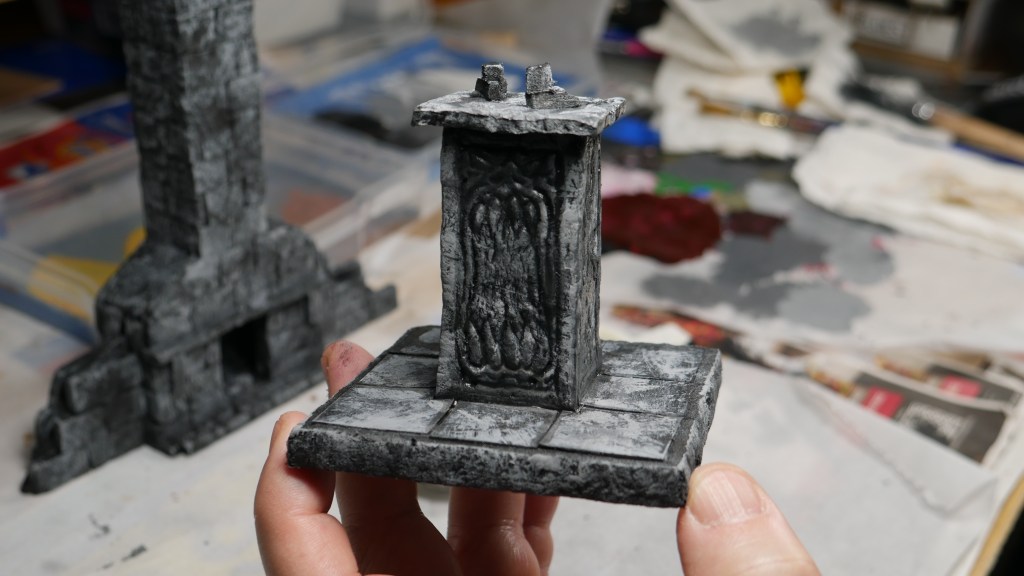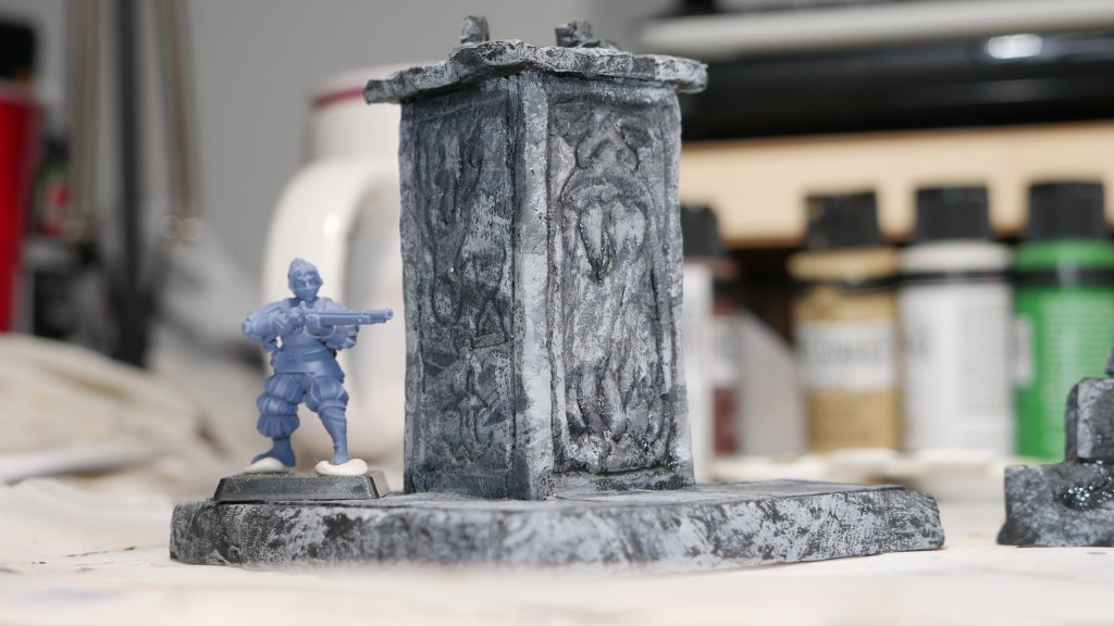 Here are a couple of the scatter terrain pieces – the Chimney and the Monument. I basically just dry-brushed light gray over the black primer.