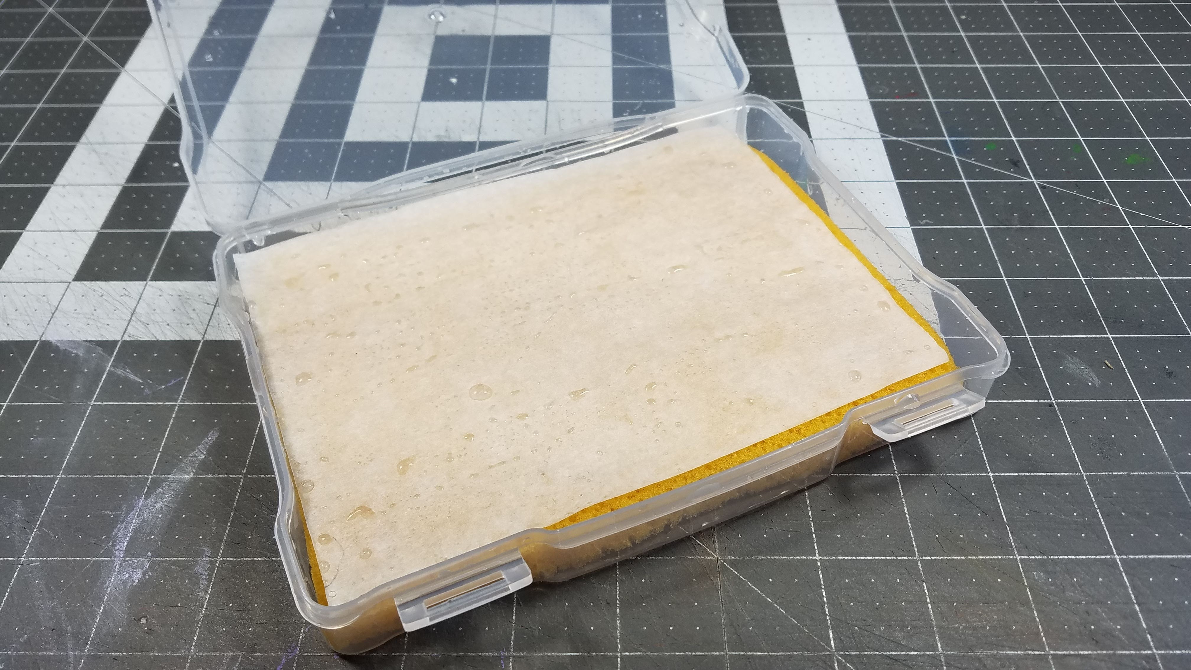 - Cut a piece of parchment paper to fit in the container above the sponge