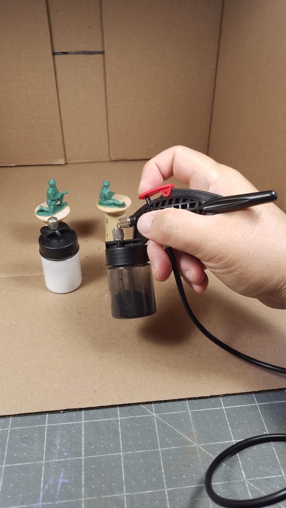I got out the Harbor Freight airbrush setup (a compressor and starter airbrush) This type does not have a tank to fill so it is constantly running while in use. It supplies sufficient air to spray the paint. The brush comes with an adjustable air nozzle. The accompanying bottom bottles also have an adjustable nozzle. I had to play around with the upward and forward positions of these to get a decent spray pattern.